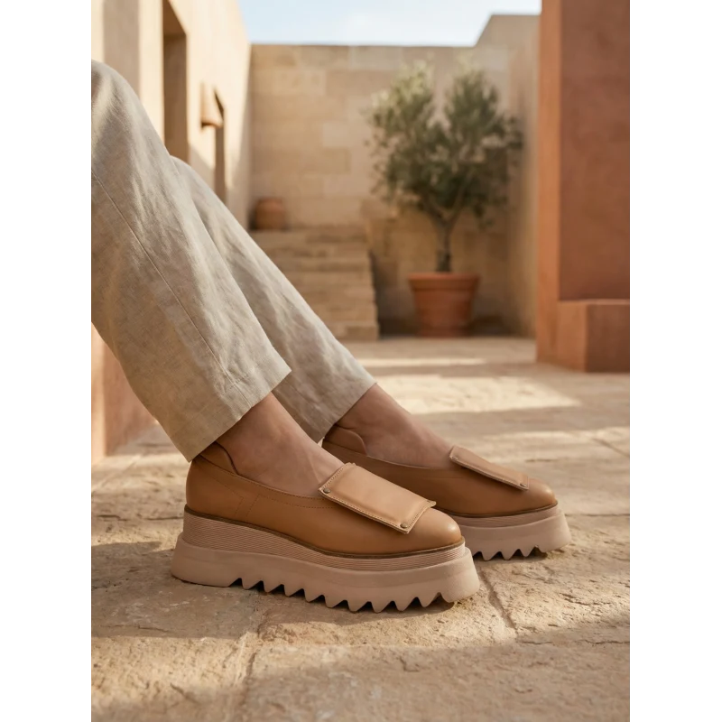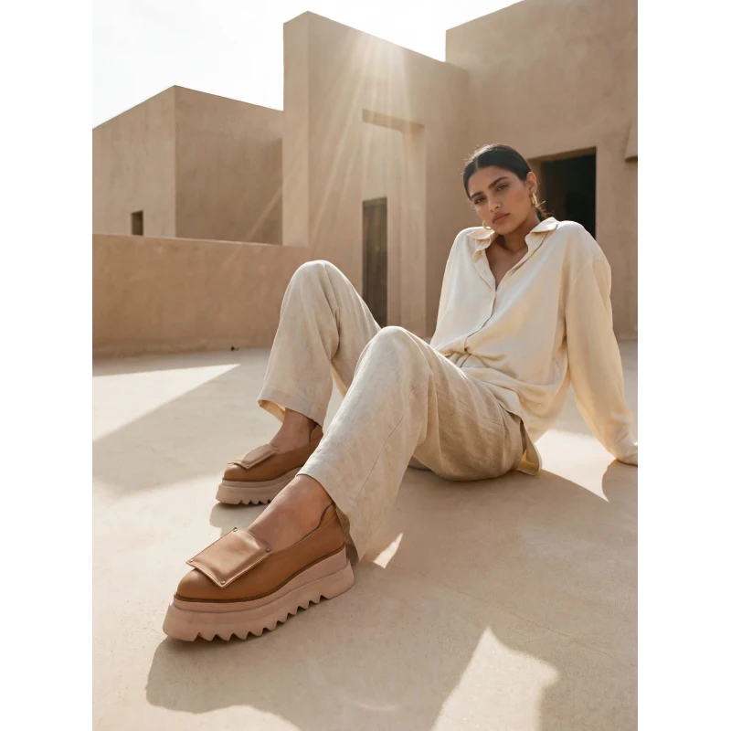 The square application creates a strong graphic accent, defining a clean and structured design. The warm sand shade adds natural elegance and versatility, while the platform sole ensures a modern and stable silhouette.